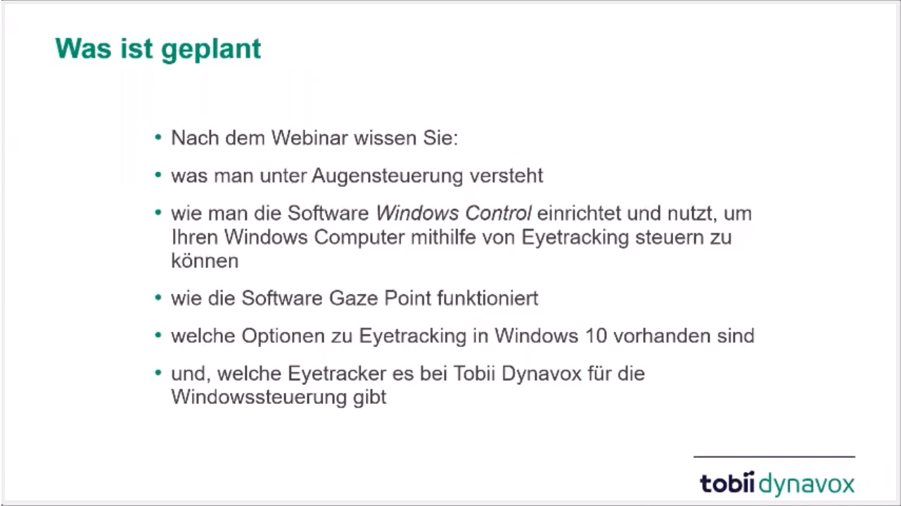 Lernen Sie in diesem Webinar Möglichkeiten zur Windows Steuerung mittels Microsoft Eye Control, Tobii Dynavox Gaze Point...