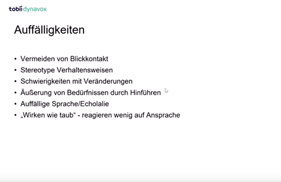 Lernen Sie in diesem TD Hörsaal durch einen Gastvortrag von Miriam Bräuer kennen, wie man auf die Bedürfnisse und Verhaltensweisen von Kinder aus dem Autismus-Spektrum eingehen kann. Welche Ursachen kann ein Verhalten haben und wie kann diesen begegnet werden? Wie kann man die Bedürfnisse von Menschen mit Unterstützter Kommunikation erfüllen? Dieses und vieles mehr wird anhand von praktischen Beispielen geschildert und mit Optionen der Vielseitigen Kommunikations-App TD Snap verknüpft.