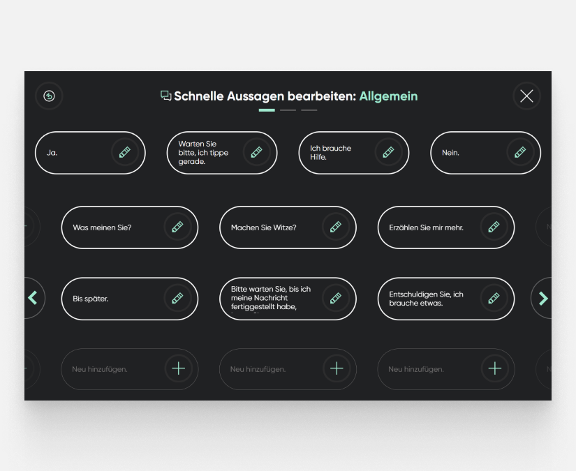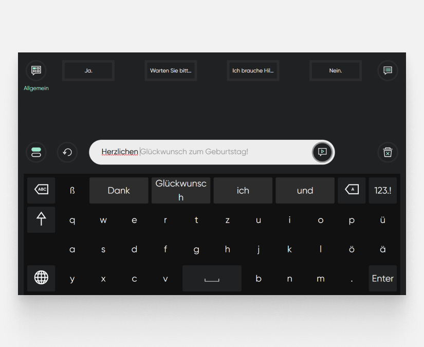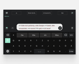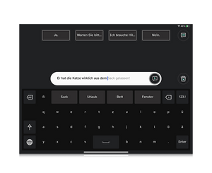 Wählen Sie aus einer großen Auswahl an Sprachen, Stimmen und Gesprächsthemen, um sich so natürlich wie möglich auszudrücken. Beteiligen Sie sich aktiver an Gesprächen mit schnellen Wortvorhersagen und einfacher Satzbearbeitung. Kommunizieren Sie von Angesicht zu Angesicht, indem Sie Ihren Bildschirm mit dem durchsichtigen Modus transparent machen und Ihren eingegebenen Text im nach hinten gerichteten Partnerfenster sichtbar machen. Bewahren Sie die Eigenschaften Ihrer Stimme mit Voice Banking - einer Möglichkeit zur Erstellung einer individuellen synthetischen Stimme, die Ihre eigene, natürliche Stimme nachstellt. Erstellen Sie einfach eine oder verwenden Sie eine bereits vorhandene Stimme von Acapela (testen Sie my-own-voice drei Monate lang kostenlos), Model Talker oder The Voice Keeper und importieren Sie diese anschließend in TD Talk.