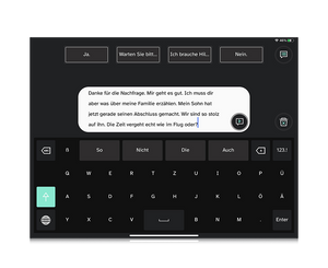 TD Talk ist auf dem TD Pilot, der TD I-Serie und dem SC Tablet vorinstalliert oder kostenlos zum Ausprobieren auf Ihrem eigenen iPad mittels Touch (keine Augensteuerung) und einer kleineren Auswahl an Sprachen und Stimmen erhältlich. Dies kann Menschen mit fortschreitenden degenerativen Erkrankungen helfen, die die App ausprobieren möchten, bevor sie ein spezielles Kommunikationsgerät benötigen.